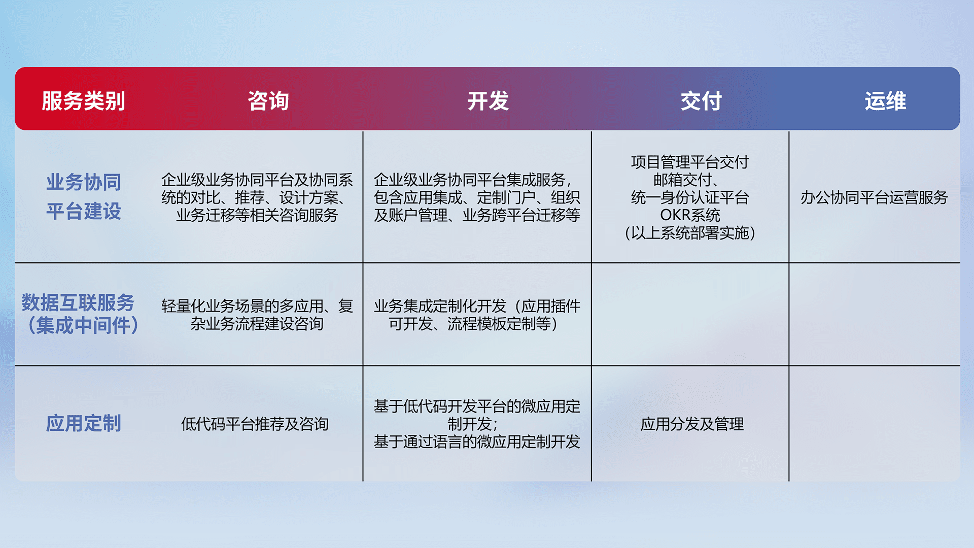 针对钉钉、、企微、、、IDaas等平台级产品提供产品的规划、、方案、、交付、、定制化开发等服务,,,,实现如统一协同办公、、智能客户服务、、、、混合会议管理、、、、智能数据查询、、等业务场景,,实现数字化转型。。